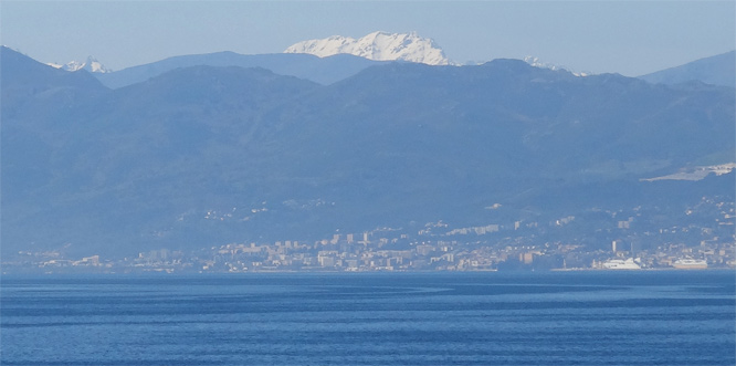 Dieser Zug fährt in einer halben Stunde für sechs Euro von I'lle Rousse nach Calvi. So eine malerische Stadt mit dem berühmten Mittelmeer-Flair! Eine interessante Festung, Granitfelsen an der Küste, Palmen, Blumen und jede Menge freier Plätze in den vielen Lokalen und Bars. Und gegenüber vom Hafen immer diese hohen Berge, schneebedeckt ...