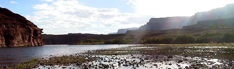 Grossvater steht im kalten Wasser und fischt: Eine Regenbogenforelle hat er schon. Vor dem einmündenden Flüsschen ist der Colorado klar, flach und breit. Ich laufe noch 250 Meter auf Steinen flussaufwärts. Dann habe ich die richtige Badewanne gefunden und leiste mir ein spezielles Vergnügen: Ich habe Waschlappen und Seife mit und wasche mich gründlich von Kopf bis Fuss in diesem kalten Wasser. Als ich die Haare wasche merke ich, wie viel Salz allein dort oben ausgeschwitzt wurde. Um 18:45 Uhr bin ich rechtzeitig zum Sonnenuntergang zurück. Wie lange habe ich es nicht mehr geschafft, den Sonnenuntergang im Liegestuhl zu bewundern und auf die ersten Sterne zu warten! Nie werde ich vergessen, wie ich das in Alice Springs genossen habe. Dort tauchten immer die 'Leitsterne' unter dem Southern Cross als erste Sterne direkt im Westen aus dem Sonnenuntergang auf. Australien wird mich nicht mehr loslassen! Aber Arizona ist wirklich Australia sehr ähnlich: Temperatur, Farben, Licht. Das ist erstaunlich, aber wiederum auch nicht: Wenn die Geologie, das Klima und die Umstände ähnlich sind, dann muss es auch ähnlich aussehen, denn es wirken ja die gleichen Naturgesetze.