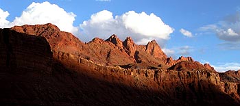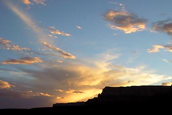 Die Vega im Zenit und der Mars im Süden, das waren die ersten Sterne, die gegen 20 Uhr zu sehen waren. Ich habe es geschafft: Ich habe den Sonnenuntergang im Liegestuhl auf meinem Podest erlebt, umgeben von dieser grandios ‚abrasierten’ Sandsteinplatte. Gegen 19 Uhr waren die Spitzen der Berge über dem Colorado River noch sehr schön in der Sonne zu sehen, im Hintergrund weisse Wolken. Nach 20 Minuten war die Sonne von diesen Bergen verschwunden und die Cliffs im Westen zeichneten sich als Scherenschnitte vor dem hellen Himmel ab. Genau an der spannendsten Stelle ging die Sonne unter: Dort stehen in den Cliffs ein paar Pinnacle, die müssen mehr als 150 Meter hoch sein!