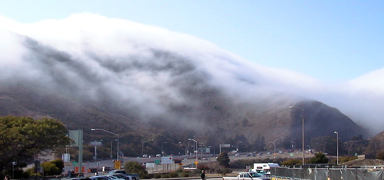 Am nächsten Tag fahre ich auf dem legendären Highway Number One nach Süden und über Tomales bei Petaluma auf den achtspurigen HWY 101. Wolkenloser Himmel, strahlender Sonnenschein, 28 Grad um 14 Uhr. Bei San Rafael mache ich meine Camera schussbereit, denn jetzt ist es nicht mehr weit bis zur Brücke. Aber was ist das: Bei Sausalito fliesst eine Wolke von rechts über die Berge! Sie kann nur vom Pacific kommen. Die Brücke wird doch nicht im Nebel liegen? |