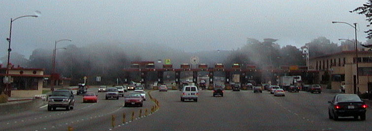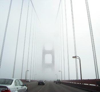 Je weiter ich auf die Brücke fahre, umso dichter wird der Nebel. Sicht vielleicht 100 Meter. Was sagt meine Camera, mit der ich ständig Bilder mache, zu diesen Lichtverhältnissen? Ich passiere die grossen Pfeiler, die Brücke ist sehr lang, wie alle anderen fahre ich die 70 km/h, die hier vorgeschrieben sind. Dann habe ich das andere Ufer erreicht. Hier wird die Maut-Schleuse passiert: Drei Dollar sind durch das Fenster zu reichen. Das mache ich gerne, aber dem Officer sage ich: ’Da komme ich extra aus Germany, um die Brücke zu sehen, und Ihr schiebt gerade eine Wolke über die Brücke!' Der schwarze Mann lacht breit und wünscht mir einen angenehmen Tag in San Francisco. Dieser Tag ist nicht lang, denn ich fahre gleich wieder rechts raus, wende und fahre auf der Gegenseite wieder hoch zur Brücke. Nur für Sekunden sehe ich auf dieser Strasse unten die tolle Skyline von San Francisco in der Sonne liegen. Es ist offensichtlich nur eine 200 Meter hohe Nebelbank, die vom Pacific in das Tal gedrückt wird, das diese tolle Brücke überspannt. |