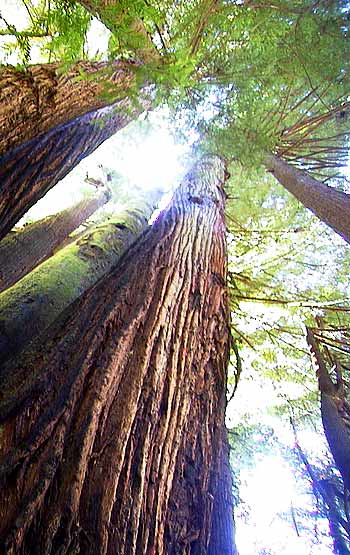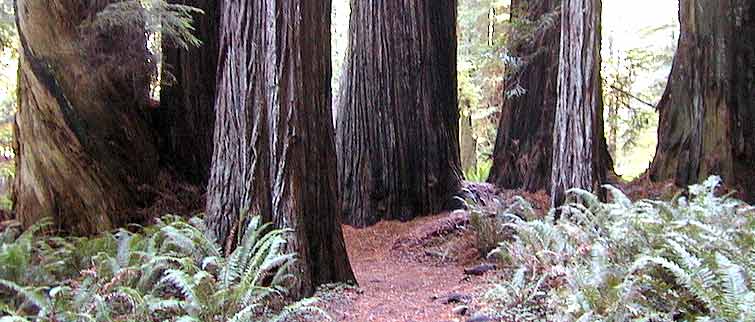 National Park Eine herrliche Küste nördlich von Patricks Point, wo ich so gut geschlafen habe, dass ich erst um 9:30 Uhr aufgewacht bin! Am Abend vorher hatte ich aus dem vielen Papier, was ich über die Redwoods gesammelt habe, die Fakten über diese Bäume zusammen gestellt. Nach einer Stunde habe ich an diesem sonnigen Morgen gefrühstückt, den Generator verpackt und die Küche aufgeräumt, es kann losgehen. Herrlicher Sonnenschein den ganzen Tag, aber kühl. Im Radio höre ich, dass in Dakota der Verkehr zusammengebrochen ist, weil es in der Nacht heftig geschneit hat! Wo liegt Dakota? 300 Kilometer südlich von Saskatchewan ... Da muss ich aber machen, dass ich nach Hause komme! Ich fahre gar nicht weit, da bin ich schon am Visitor Center des Redwood National Park. Ich lasse mir eine Karte geben und erklären, wo die grössten Bäume zu sehen sind: Man muss vom HWY 101 wieder auf die alte Strasse abzweigen, das ist jetzt der Newton B. Drury Scenic Parkway. Schon nach einem Kilometer lande ich wieder in einem Visitor Center, diesmal gehört es zum Prärie Creek Redwood State Park. Hier erkundige ich mich nach Humboldt und nach Wanderwegen.