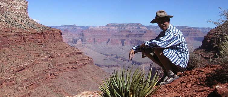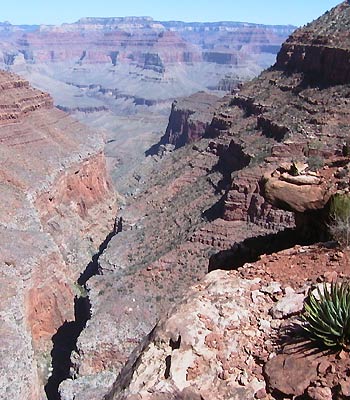 Hier mache ich auch ein paar Fotos mit Selbstauslöser. Man sieht das GPS auf dem Felsen liegen. Wer wird wann als nächster hier stehen und ein Foto machen? Vorsicht ist geboten. Nur noch einen Schritt weiter und es geht senkrecht nach unten! Aber nur von diesem Hügel aus kann man in dieser Höhe vom Hermit Trail aus in den Canyon hineinblicken. Dann mache ich Fotos der Umgebung. Bewundere die dunkelroten Sandsteinsplitter, aus denen der ganze Untergrund besteht. Agaven, Kakteen und stachlige Sträucher, die den Boden nicht bedecken. Ein Wunder, wo sie hier Nahrung und Wasser her bekommen. |