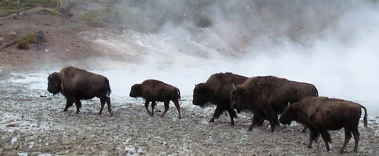 Vorher gibt es so grandiose Aussichten in den Canyon, dass ich auf den Lake verzichte. Spektakuläre Sicht schräg gegenüber vom Inspiration Point, den man von hier aus sehen kann. Der Morgen ist zwar ohne Sonne, aber die Sicht ist sehr klar. In diesem Nationalpark wurde wahrscheinlich die amerikanische Art des Wanderns erfunden: Alle wirklich interessanten Stellen sind mit dem Auto zu erreichen und dann braucht man sich nur noch 20 oder maximal 100 Meter bis zum nächsten View Point zu schleppen. Oft kann man auch im Auto bleiben und fotografieren! Auf diese Weise bekommt man sehr schnell einen Überblick auch über ein grosses Gebiet, wie beispielsweise diesen Nationalpark. Ausserdem ist diese Art des Wanderns besonders für die vielen alten Leute sehr angenehm. Auf Reisen gehen vor allen Dingen die Alten, die Jungen haben nicht nur in America keine Zeit. Man muss es nicht so machen, denn überall gibt es herrliche Wanderwege. Bisons
