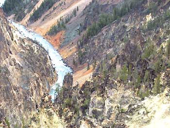 Canyon Riesige Schutthalden in Gelb und Rot, bis zu 300 Meter tief, auch durch Wassererosion geformt und unten fliesst der Yellowstone River. Das ist beeindruckend. Besonders auch, weil die Beleuchtung heute ständig wechselt. Alles leuchtet in der Sonne, dunkle Schatten über dem leuchtenden Canyon. |