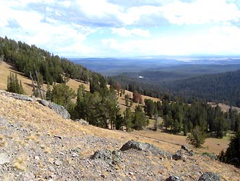 Links oben der Mt. Washburn, 3122 Meter hoch und aus Basalt. Auch ein ehemaliger Vulkan. Am Duraven Pass kann man in einer vier bis fünfstündigen Wanderung auf diesen Berg steigen. Vielleicht hätte ich das ohne Heuschnupf gemacht. So steige ich nur bis in eine Höhe von 2.900 m. Dort steht man am Rand des ehemaligen Kraters und hat eine herrliche Sicht bis hinüber zur anderen Kraterseite.