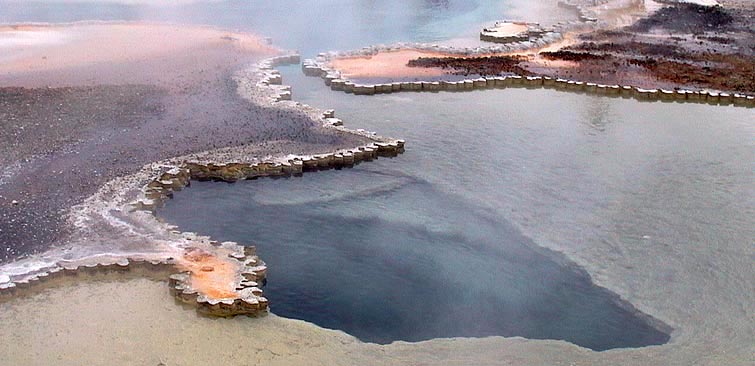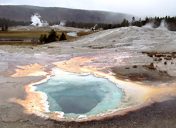 Gleich zweifach sind diese heissen Quellen farbig. Erstens wäscht das heisse Wasser im Untergrund Mineralien aus, die sich dann an der Oberfläche absetzen und oxydieren. So ist auch die Farbigkeit des Yellowstone Canyon entstanden. Die zweite Variante besorgen Bakterien, Algen und andere Mikroorganismen, die sich im heissen Wasser wohl fühlen und dort angesiedelt haben. Auch sie liegen in dem Farbspektrum der Mineralien: Gelb, braun, grün, blau, rot und alle Zwischentöne. Die ganze Farbpalette ist vertreten. Deshalb kann man hier wunderbare Bilder machen, wenn man die Zeit hat, auf das richtige Wetter und auf die Fontänen der Geysirs zu warten. Der Old Faithful
