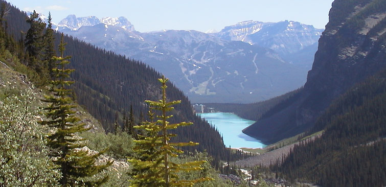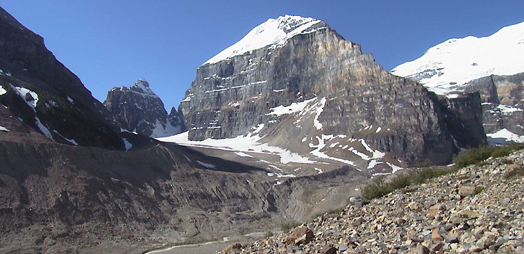 Meter über dem Lake Louise an der Steilwand, des Mt. Victoria, auf der oben ein Gletscher und viel Schnee liegen. Es donnert immer wieder, wenn sich oben Schneewächten lösen, die dann ein paar hundert Meter abstürzen. |