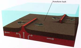 in den Platten und zu Bruchlinien (transform fault) senkrecht zur