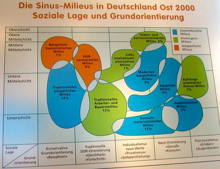 Die Sinus Sociavision Heidelberg/Paris hat die deutschen Ost West Differenzen hinsichtlich der sozialen Lage und der Grundorientierung quantifiziert und grafisch dargestellt. Das Ergebnis ist interessant, müsste aber deutlich mehr interpretiert und hinterfragt werden. Hier sind zwei dieser Grafiken. Wer mehr darüber erfahren will, kann sich im Ausstellungskatalog *) informieren. Die Suchmaschinen liefert nichts zum Stichwort Sinus Sociavision. Das Institut mit dem so wohlklingenden Namen scheint im Internet (noch ?) nicht präsent zu sein. *) Ausstellungskatalog