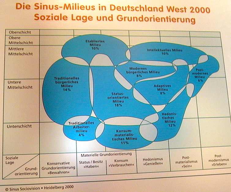 Im Museum für Kommunikation, Berlin, Leipziger Strasse, findet gerade eine Sonderausstellung statt: WunderbareWerbeWelten. Aus dem Prospekt der Ausstellung: Die Ausstellung macht Geschichte, Hintergründe und Wirkweise von Werbung umfassend erfahrbar. Gezeigt wird, wie Agenturen mittels Marktforschung, Werbestrategien und Markenwelten den Verbraucherinnen und Verbrauchern auf der Spur sind. Zu welcher Zielgruppe gehöre ich? Grundlagen und Methoden der Marktforschung führen vor Augen, wie die Konsumenten mit Hilfe von Milieustudien, 'Warenkorb' und Trendscouting eingekreist und durchleuchtet werden.