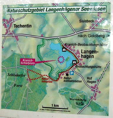 Das Naturschutzgebiet Langenhägener Seewiesen gehört zum Naturpark Nossentiner Schwinzer Heide. Von Dobbertin aus muss man zehn Kilometer über Feldwege oder Landstrassen strampeln, um mit dem Fahrrad hier her zu kommen. Ein grosses Feuchtgebiet an einem flachen See. Das Dorf Langenhagen. Hier befindet sich der Schlafplatz von bis zu dreitausend Kranichen. Sie rasten hier in den Monaten September/Oktober, bevor sie in wärmere, südliche Gefilde weiterziehen. Im flachen Wasser sind sie geschützt vor Räubern und Menschen. Übernachten in Ruhe und Sicherheit. Spätestens zwei Stunden nach Sonnenaufgang fliegen sie in kleinen Gruppen 'auf Arbeit': Nahrungssuche im Umkreis von fünfzig Kilometern. Bei Sonnenuntergang finden sich alle wieder ein. Die Gruppen sammeln sich in der Luft, drehen grosse Runden und fallen dann auf dem Schlafplatz ein. |
