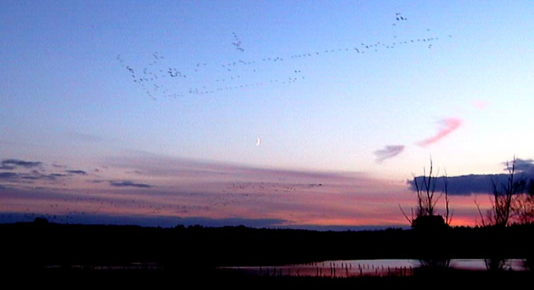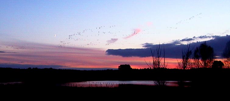 Nur wenige Minuten später taucht weit im Osten ein riesiger Zug von Kranichen auf. Ich schätze, es sind mindestens 500 Vögel. In einem grossen Bogen fliegen sie über die Strasse nach Goldberg und drehen dann nach Süden ab. Im Sonnenuntergang fliegen sie hoch über ihren Schlafplatz und kreisen noch eine Weile, bis sie sich auf dem Wasser niederlassen. Im Abendrot steht die blasse Mondsichel. |