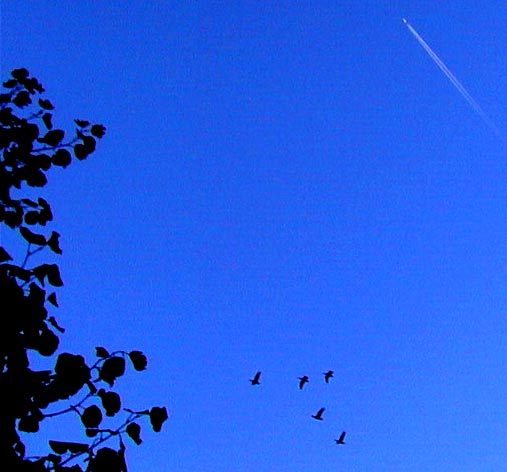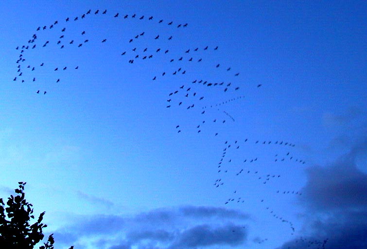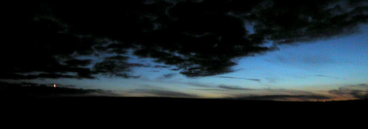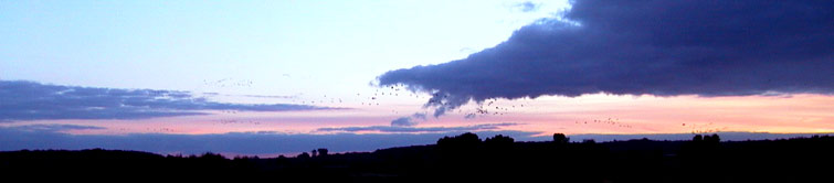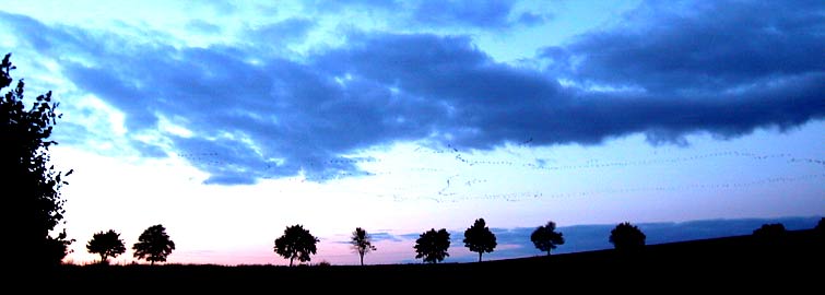 Gegen 19 Uhr sind die meisten Kraniche gelandet. Ich fahre im Zwielicht in Richtung Goldberg. Hinter mir der helle Horizont, vor mir fast schon Nacht. Immer noch sind Kraniche in der Luft. Ich sehe sie nicht, aber ich höre sie. Sehen mich die Autos auf meinem spärlich beleuchteten Fahrrad? Zwei Kilometer vor Dobbertin steht der Mond tief über dem Horizont, Wolken verschlucken ihn. Jürgen Albrecht, 13. Oktober 2002 |