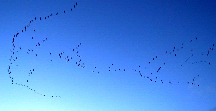 Mit einem heissen Tee habe ich mich vor dem nördlichen Ortseingang von Langenhaben postiert. Eine grosse Gruppe von Kranichen fliegt um 18:37 Uhr von Ost nach West fast über mich hinweg. |