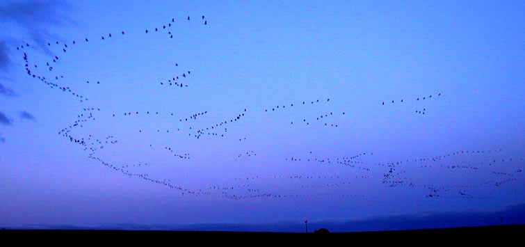 Am besten sind die Kraniche von der Langenhägener Dorfstrasse aus zu beobachten. Man ist auf Neugierige eingerichtet: Naturstation, Lehrpfad, Beobachtungshütten. Heissen Tee und eine Info Broschüre bekommt man an einem Imbissstand. Zehn Autos stehen heute Abend hier. Viel mehr sind es am Wochenende. Ferngläser, Videokameras, Fotoapparate, auch das Fernsehen kommt immer mal vorbei. Es ist schwierig, gute Bilder zu machen: Es wird dunkel, man ist mindestens 600 Meter vom Schlafplatz entfernt, der schwierig einzusehen ist. Die Fluchtdistanz der Kraniche beträgt 200 Meter. Da ist eine lange Brennweite, ein Stativ und viel Glück gefragt. Ich habe nur Glück und meine PowerShot A50: Der Zoom funktioniert nur noch bei Temperaturen über 30 Grad ... also hier nicht. |