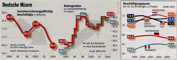 Dauerarbeitslosigkeit in Deutschland Das deutsche Grundproblem ist die Arbeitslosigkeit. Ohne Jobs keine Kaufkraft, keine Nachfrage und keine Steuereinnahmen. Seit mindestens 20 Jahren steigt die Arbeitslosigkeit in Deutschland. Alle Parteien haben zwar versprochen, die Arbeitslosigkeit gleich nach der Wahl zu halbieren (Kohl und Schröder sogar mehrfach ...), aber keine Regierung war in der Lage, Jobs zu schaffen oder wenigstens den Anstieg der Arbeitslosigkeit zu stoppen. Im Juli 2004 beträgt