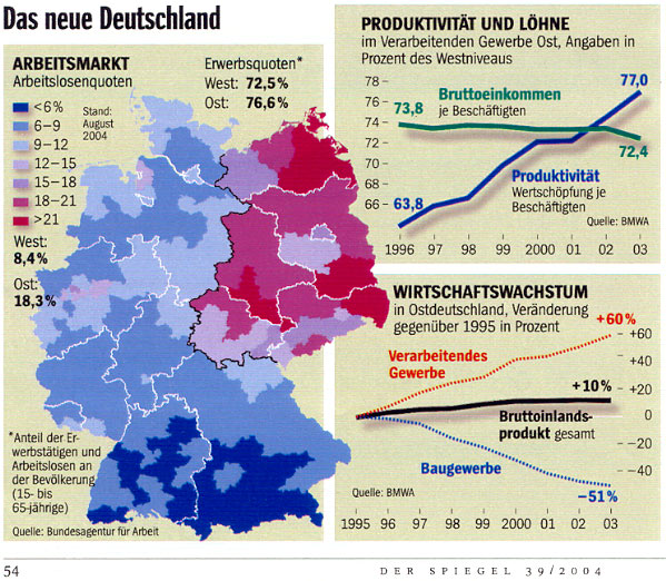 Es geht bergab Es geht uns nicht schlecht, aber jeder fühlt, es geht bergab. Das ist die gegenwärtige Stimmungslage in Deutschland. Die Ursachen dafür sind in den neuen Ländern völlig anders als in der alten Bundesrepublik. Dort ging es seit 1950 kontinuierlich aufwärts. Es gab Arbeitsplätze, man konnte Geld verdienen, der persönliche Wohlstand und der Wohlstand der Kommunen und des ganzen Landes stiegen jährlich. An den kalten Krieg hatte man sich gewöhnt, denn die latente Gefahr dauerte schon 30 Jahre. Die DDR existierte in den Köpfen der Westdeutschen praktisch nicht. 'Der Russe' war nicht zu sehen, die Amerikaner spielten die starken Beschützer und die vielen in Deutschland stationierten GIs brachten Geld ins Land. Welches Auto in diesem Jahr kaufen und wohin im Urlaub?? Andere Probleme hatte man nicht. Spätestens seit 1995 merkt man eine starke Veränderung: Die Arbeitslosigkeit steigt, Staat und Kommunen haben immer weniger Geld, kein Zuwachs auf dem Sparkonto. Die Ursache ist schnell ausgemacht: Der Milliardentransfer in die ehemalige DDR. In Ostdeutschland eine völlig andere Situation nach 1945: Diktatur, Armut, Bevormundung, Denk- und Reiseverbot in der DDR. In 40 Jahren entsteht eine mittellose Notgemeinschaft. Aber es gibt soviel Arbeit, dass Vietnamesen und Afrikaner ins Land geholt werden und für alle existiert soziale Sicherheit auf gleichem, niedrigem Niveau bis 1989. Erst mit der Wende ist der II. Weltkrieg auch für Ostdeutschland beendet. Ein Umbruch in einer ähnlichen Grössenordnung, wie bereits 1945 erlebt, setzte ein: Neustart mit einem Westgeld-Konto von 2.000 DM. Stilllegung der unproduktiven Industrie. Von der Vollbeschäftigung in die nie gekannte Arbeitslosigkeit. Westgeld, Freiheit, ganz neue Bedürfnisse, aber zu wenig Geld. Aber genug 'Westgeld' für die neue Wohnungseinrichtung, das neue Auto und Urlaub auf Mallorca. Nie vorher hat ein ganzes Volk komplette Wohnungseinrichtungen einschliesslich der funktionierenden Autos auf den Müll gekippt! Norbert Blüm hat es 1990 einmal unverblümt gesagt: Der Osten wurde mit Geld ruhig gestellt. Produziert wurde für den Osten in Westdeutschland: Boom und Arbeitsplätze. Aber schon drei Jahre nach der Wende spürt man im Osten eine deutliche Veränderung: Die Verheissungen erfüllen sich nicht, keine blühenden Landschaften, sondern das Gegenteil: Keine Industrieproduktion, keine Jobs, unaufhaltsam steigende Langzeitarbeitslosigkeit, Abwanderung in den Westen, verlorene Illusionen. Auch hier ist die Ursache schnell erkannt: Ungleiche Löhne, Gehälter, Renten und Sparkonten im Osten, aber gleiche Preise wie im Westen. Dazu massive Standortnachteile und keine Perspektive. Die Ostdeutschen sind Deutsche zweiter Klasse. Allein schon durch ihre DDR-Vergangenheit.