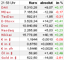 boerse.ard.de: An den deutschen Börsen stand der Verfallstag im Vordergrund, der für teils kräftige Kursbewegung sorgte. Beflügelnd wirkte vor allem der Bericht des ifo-Instituts. Demnach ist die Stimmung in der deutschen Wirtschaft derzeit so gut wie seit dem Sommer des Boomjahres 2000 nicht mehr. Das ließ Börsianer auch bei Aktien zugreifen. Der Dax erklomm ein neues Hoch bei 5.357 Punkten. n-tv: Nun auch in Thüringen Gammelfleisch - In Thüringen ist erstmals verdorbenes Fleisch entdeckt worden. Bei der Kontrolle eines Lebensmittelbetriebes in Westthüringen seien rund 1,7 Tonnen verdorbenes Geflügel- sowie rund 180 Kilogramm verdorbenes Rindfleisch sichergestellt worden, teilte das Gesundheitsministerium am Freitag in Erfurt mit. Berliner Morgenpost: Männern ab 35 Jahren ist die Gesundheit wichtiger als die Potenz. Wenn sie Eigenschaften aus ihrer Jugend zurückhaben könnten, würde sich mehr als die Hälfte für die Gesundheit entscheiden. Rund 44 Prozent der 1055 befragten Männer zwischen 35 und 60 Jahren wünschen sich zudem ihre Unabhängigkeit zurück. Auf Platz drei folgt mit 29 Prozent die jugendliche Potenz. Jeder vierte wäre gern wieder so sportlich wie früher. RP Online: Bundeslandwirtschaftsminister Horst Seehofer (CSU) hat eine klare Abkehr von der Politik seiner Vorgängerin Renate Künast (Grüne) angekündigt: Er werde die konventionelle Landwirtschaft dem Ökolandbau wieder gleichstellen und den Anbau von genveränderten Pflanzen voranbringen, sagte Seehofer in einem Zeitungsgespräch.