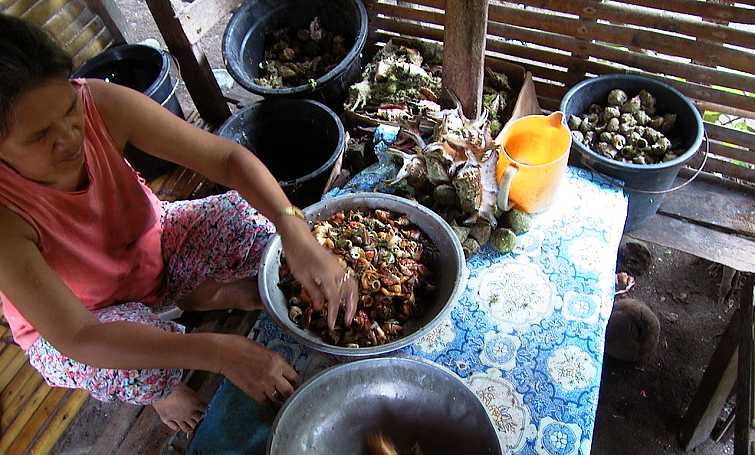 Täglich bringen ihr die Fischer körbeweise Schnecken. Die müssen