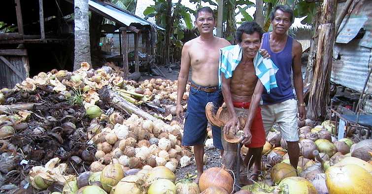 einem Stahldorn wird die Copra-Hülle von der Cocosnuss getrennt.