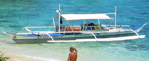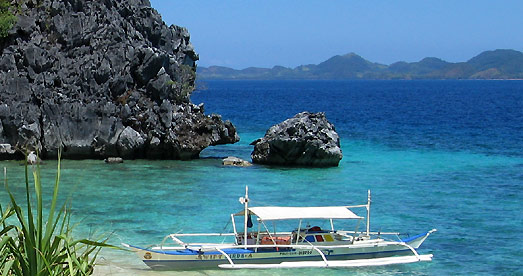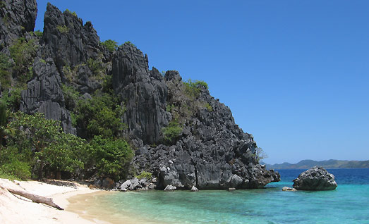 Dreimal haben wir die gleiche schöne Banca mit einem relativ leisen Dieselmotor und zwei freundlichen Drivern gemietet. Das erste Mal haben wir uns die schönen Schnorchelplätze an der Nordküste von Coron Island zeigen lassen. Dabei sind wir auch über die steilen Kalksteinfelsen mit der so typischen Erosionsform gestiegen und haben das unglaublich klare Wasser des Lake Kayangan bewundert, ein Süsswassersee. Die zweite Tour führte zur Black Island, eine unbewohnte, steile Kalksteininsel mit bis zu 240 Meter hohen Felsen. Das ist die Insel, die am weitesten westlich von Busuanga Island, am Rande der Gutob Bay, liegt. Die 20 bis 30 Meter lange und einen Meter hohe Dünung weist darauf hin, dass man sich hier schon im offenen, Südchinesischen Meer befindet. Weiter westlich bekommt man erst wieder in Vietnam oder Thailand Boden unter die Füsse. Diese Insel ist ein wirkliches Erlebnis, der weisse Strand, das klare Wasser, die Korallen, das helle Licht, alles ist mit dem Attribut unglaublich zu versehen und das ist wirklich wörtlich zu nehmen. Alleine die Anfahrt auf diese Insel (drei Stunden) ist diese Tour wert.