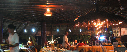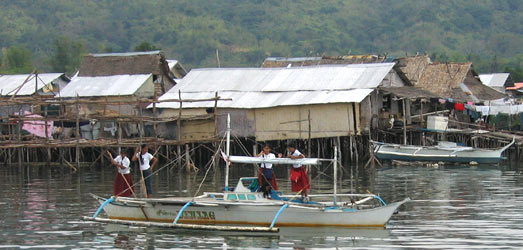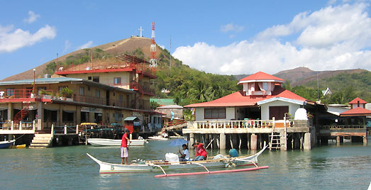 Aus dem Philippinen-Handbuch von Jens Peters hatten wir uns zwei Lodges ausgesucht. Die L&M P Sea Lodge und das Kokosnuss Garden Resort hatten auf unsere E-Mail-Anfrage nicht reagiert. Jetzt liessen wir uns mit einem Tricycle zur L&M P Sea Lodge fahren. Die freundliche Dame im Restaurant hatte zwar kein Zimmer mehr für uns, aber ein Notquartier unter dem Dach, WC eine Treppe tiefer. Morgen schon wird ein Zimmer frei. Wir wohnten die ganze Zeit in dieser Lodge. Sie liegt zentral am Markt und ist trotzdem ruhig, sie steht auf Pfählen über dem Meer, das Restaurant ist hervorragend und preiswert, unser Zimmer war einfach, aber zweckmässig ausgestattet, verfügte über WC und Tabo und kostete pro Nacht für zwei Personen 250 P. Es gibt auch zwei Zimmer mit Blick aufs Meer und warmer Dusche (Nr. 7 und 8), die waren aber leider schon belegt. Den schönen Balkon vor diesen Zimmern kann jeder benutzen und hier haben wir fast jeden Abend in sehr bequemen Plastik-Liegestühlen den Sonnenuntergang auf uns wirken lassen.