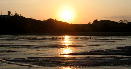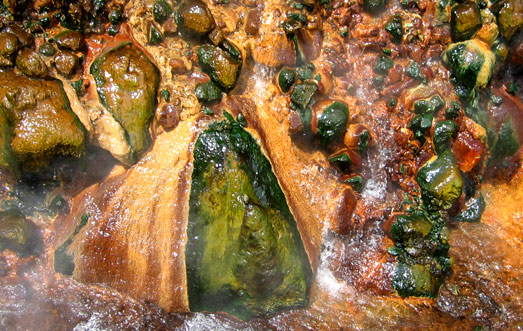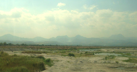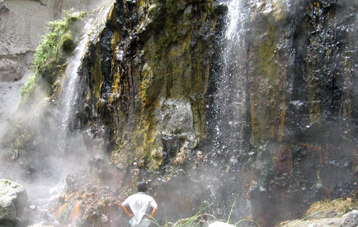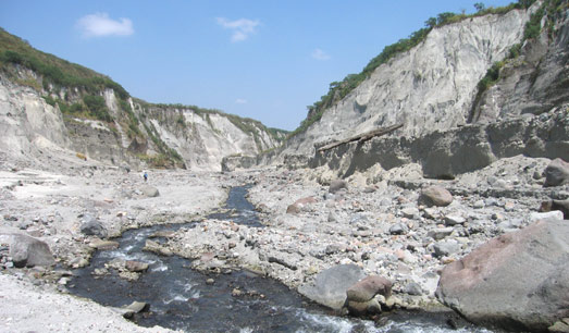 Gleich am nächsten Tag nach der Ankunft in Angeles gehe ich auf Tour: Hiking at the Pinatubo zum Standardpreis von 980 Peso. Ein nettes, deutsches Pärchen, das zufällig im gleichen Hotel wie ich wohnt, ist mit von der Partie. Mit einem Jeep werden wir vom Hotel aus rund 15 Kilometer nach Norden gefahren. Dort beginnt die Wanderung, leicht bergauf in einem Flussbett. In scharfem Schritt geht es knapp drei Stunden durch eine Mondlandschaft: Rechts und links hohe Aschewände, Sand, Geröll und Steine im Fluss, der immer wärmer wird, je weiter man an die Quelle herankommt. Die Hälfte der Strecke wird vorwiegend im Wasser zurückgelegt. Bei solchen Gelegenheiten kann ich nur immer wieder meine TeVa-Sandalen loben: Simply the best! An der Quelle dampft heisses Wasser aus steilen Wänden. Wir sind an diesem Hot Spring noch 800 Meter unter dem Kratergipfel.