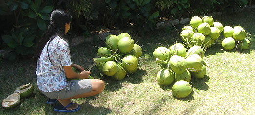 Nida heisst das freundliche und grundanständige Hausmädchen, das jeden Morgen möglichst zwei Stunden mein Apartment gründlichst sauber machen möchte. Ich lasse sie nur jeden dritten Tag in meine Wohnung. Aber sobald ich das Ressort verlasse, wird hinter mir sauber gemacht und Ordnung geschaffen. Nibo ist der Mann von Nida, er ist der Housekeeper. Er kümmert sich um die Bauerhaltung, den Kompressor bei Brown Out, den Garten und er sieht es auch als seine Aufgabe an, den Strand vor dem Gartentor sauber zu halten. Schon allein das macht viel Arbeit, denn bei viel Wind spuckt die See hier alles aus, was sie auf der anderen Seite geschluckt hat: Kokosnüsse, Baumstämme, Palmwedel, Zivilisationsmüll und grosse Bananenstauden, die am schwierigsten zu beseitigen sind. Was nicht brennt, wird eingegraben. Nida hat glänzende, schwarze Haare, fast hüftlang. Vor ein paar Tagen machte sie meine Dusche sauber. Dort steht eine grüne Plastikflasche mit Haarwaschmittel. Der Aufkleber zeigt eine Philippina mit langen, schwarzen Haaren, wie Nida sie hat. Sie guckt auf meinen Kopf mit den sehr kurz geschnittenen Haaren, und mit viel Unverständnis in ihrem Blick, aber völlig ernsthaft, fragt sie mich: 'Warum kaufst Du Dir Haarwaschmittel, wenn Du keine Haare mehr hast?!' Puerto Galera, 11. März 2005, 9:23 Wo