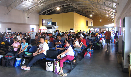 Im Terminal ist Platz für mindestens 1.500 Menschen. Bänke aus Sitzschalen, die Aircooler auf maximale Leistung eingestellt, Toiletten und viele Verkaufsstände, keine Probleme mit der Versorgung. Ein lautes Dauergeräusch in der Luft von den vielen Menschen und einigen, laut aufgedrehten Monitoren mit dem örtlichen Fernsehprogramm oder Action Thrillern, immer wieder übertönt von den Schreien der mitreisenden Kampfhähne. Das Ticket für die Superferry (1.720 P pro Person) sollte man sich vorher besorgen. Das Platzangebot ist gross aber begrenzt, denn die Fähre nach Coron verkehrt nur einmal wöchentlich und es ist die preisgünstigste Verbindung. Als Alternative bleibt nur das Flugzeug und das ist rund zwei Drittel teurer. Mit dem Ticket wurde jeder Reisende aufgefordert, vier Stunden vor Abfahrt der Fähre am Terminal zu sein. Da wir ordentliche Leute sind, sassen wir um 13 Uhr auf den harten und kalten Bänken des Wartesaales, die Fähre sollte planmässig um 16:45 Uhr abfahren, aber von ihr war nichts zu sehen.