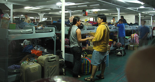Woche in Palawan Am 25.Februar 2005 sind wir gestartet und von Puerto Galera mit der Fähre, die täglich mehrmals verkehrt, nach Batangas übergesetzt. Von dort fährt stündlich ein Aircon-Bus nach Manila. In zwei bis drei Stunden ist man an der LRT Station Gil Puyat (eine 'S-Bahn'). Von dort sind wir ein paar Stationen gefahren und haben in einem Kaufhaus nahe bei der Station Pedro Gil noch schnell einen CF-Chip für meine Camera gekauft, denn ich hatte bei dieser Kurzreise keinen Laptop dabei (CF 256 MB für 1.625 P = 22 Euro). Vom Kaufhaus zum South Harbour, dem Terminal der Superferry, mit der Taxe, denn das ist nicht weit. Vor dem Eingang des Terminals mehrere Gepäckkontrollen und Leibesvisitationen, Soldaten mit MP im Anschlag, deutsche Schäferhunde als Schnüffelhelfer, aber keine Passkontrolle.