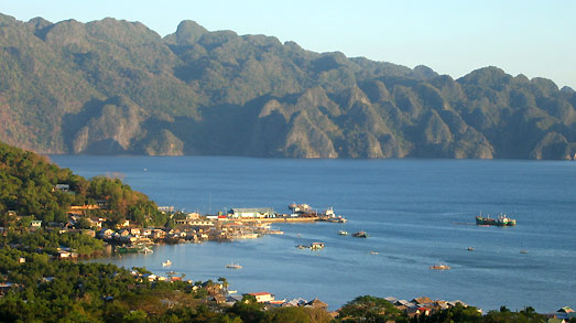 Gegen 15 Uhr war das Schiff immer noch nicht da. Die Lautsprecherdurchsagen in Tagalog hatten wir nicht verstanden, aber uns dämmerte: Die Fähre hat Verspätung. Eine Nachfrage ergab, Our Lady of Medjugorje hatte einen Maschinenschaden, inzwischen fährt sie wieder, Ankunft in Manila gegen Mitternacht, Abfahrt am Morgen gegen 5 Uhr. Die Nacht verbrachten wir mehr schlecht als recht auf den für das Liegen nicht konzipierten Sitzschalen. Gegen 2 Uhr begann das Einchecken, ab drei Uhr hatten wir ein bequemes Bett und nach einem schönen Sonnenaufgang legte die Fähre um 6:20 Uhr ab. Die Verspätung hatte eine sehr angenehme Nachwirkung: Die Fahrt nach Coron fand am Tage statt und nicht wie vorgesehen in der Nacht. So konnten wir sehr schön verfolgen, wie das grosse Schiff an der Nord- und Westküste von Mindoro nach Süden fuhr. Mit dem GPS und einer einfache Strassenkarte war jederzeit die Position des Schiffes festzustellen und so wussten wir, was es gerade zu sehen gab. Bei Sonnenuntergang hatten wir schon Sicht auf Busuanga Island und die vorgelagerten Inseln. Um 19 Uhr standen wir auf dem Pier von Coron und wurden durch ein grosses, illuminiertes Kreuz über der Stadt auf dem Mt. Tapyas begrüsst.