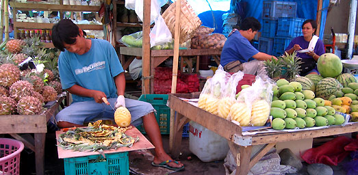 Ananas kann man auch 'formatiert' kaufen. Die Schale wird abgeschnitten und die Ananas erhält durch ein steiles 'Gewinde' ein völlig anderes Aussehen. Sie kostet ein paar Peso mehr (50 statt 40 Peso) und diese Peso verdient sich der junge Mann, der mindestens 20 Minuten braucht, bis er die Ananas mit einem scharfen Messer ordentlich in die neue Form gebracht hat. Auch junge, grüne Kokosnüsse werden formatiert, allerdings nicht mit dem Messer, sondern mit der Machete. Mit sehr gezielten Schlägen erhält die Kokosnuss unten eine Standfläche und oben muss der Schnitt so genau sitzen, dass der farblose Saft der Kokosnuss nicht ausläuft. Die noch weiche Schale muss aber so weit abgeschnitten sein, dass man durch das weiche, weisse Fleisch einen Strohhalm stecken kann. So trinken aber nur die Touristen den Saft der Kokosmilch. Für die Einheimischen wird die Kokosnuss am Markt geöffnet und der Saft wird in grosse Behälter gefüllt und mit dem weissen Fleisch vermischt. Dieser Saft wird dann in Plastikbechern zu je zwei Peso verkauft. Kokosmilch ist etwas anderes: Dazu muss das Kokosfleisch zerkleinert und ausgepresst werden. Aus dieser weissen Milch, die vorwiegend zum Kochen verwendet wird, kann aber auch Kokosöl und Kokosseife hergestellt werden. Iba, 01. April 2005, 22:21 Short