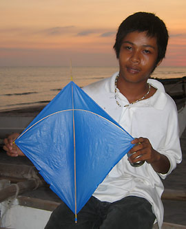 Hier können die Jungen noch Drachen bauten! Auf dem Markt kann man fertige Drachen für ein paar Peso kaufen, aber die Kinder der Fischer hier am Strand kommen nicht auf solche Ideen. Das Material für einen guten Drachen liegt überall herum: Plastikfolie und Bambus. Angelsehne brauchen die Fischer auch jeden Tag, wozu also einen Drachen kaufen? Diesen Jungen habe ich beim Sonnenuntergang am Strand beobachtet. Er hatte die Angelsehne auf eine Bierbüchse gewickelt, zog regelmässig daran, wickelte und lief dabei der Sonne entgegen. Seinen Drachen habe ich erst nach intensivem Suchen am Abendhimmel entdeckt. Er war sehr hoch und wegen seiner Farbe kaum zu sehen. ausserdem bewegte er sich kaum im leichten, aber gleichmässigen Wind. Nach dem Sonnenuntergang hatte der Junge den Drachen eingeholt und ich konnte ihn mir ansehen: Eine ganz einfache Konstruktion: Die Folie ist an den vier Ecken mit Angelsehne am Bambus festgebunden. Direkt an der vertikalen Leiste ist (auf der anderen Seite) die Drachenschnur befestigt. Diese Konstruktion fliegt hervorragend schon bei ganz wenig Wind und vor allen Dingen (das habe ich nie geschafft!) ohne Schwanz!