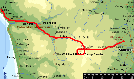 Landung um 12:33 Uhr auf einer kleinen Piste der Clark Air Base. Ein wirklich interessanter Flug, Danke an Werner Wildi für die beeindruckenden Bilder. Im Flugpreis von 100 Dollar ist der Shuttletransport inclusive und so werde ich vom Piloten auch noch zum Hotel Premiere gefahren. Hier hat man mit mir allerdings erst morgen gerechnet und das reservierte Zimmer steht noch nicht zur Verfügung. Kein Problem, denn rechts und links der Strasse gibt es weitere Hotels. Für eine Nacht miete ich mich gegenüber im Seinpost Hotel ein. Das ist mir auch wegen seines rund um die Uhr geöffneten Internetcafes (!) sehr sympathisch. Aber morgen ziehe ich rüber in das Hotel Premiere, es hat einen Swimming Pool und einen sehr schönen Garten. Allerdings fehlt die Sicht auf den Pinatubo - aber man kann nicht alles haben.