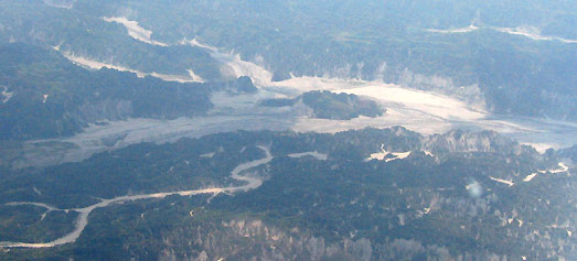 Der Pilot dirigiert die kleine Cherokee 4 (wie der Fahrer des geländegängigen Jeeps) über eines von vielen trockenen Flussbetten hoch zum Mt. Pinatubo. Nach allen Seiten fliessen diese breiten Flüsse nach unten und sie fressen sich durch die Ascheschicht des letzten Ausbruchs. Unmengen von Asche und Geröll werden in der Regenzeit von diesen Flüssen ins Tiefland und ins Südchinesische Meer geschwemmt. Zurück bleibt eine gespenstische Mondlandschaft mit bis zu 100 Metern hohen, hellgrauen Aschewänden: Das Lahargebiet.