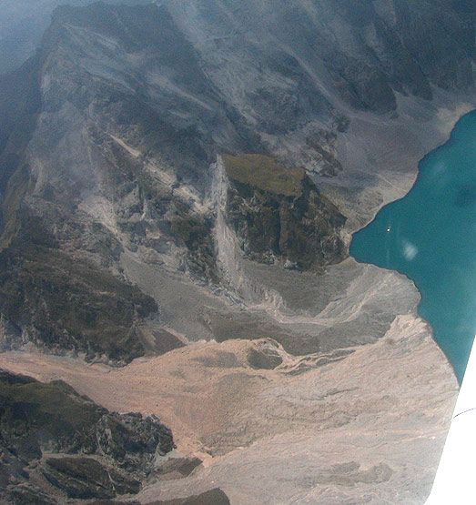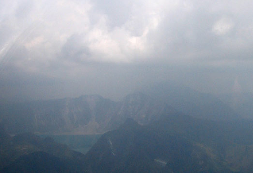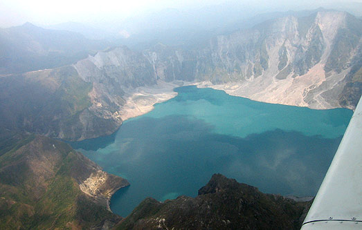 Das Flugzeug steigt weiter und dreht dabei über den Kraterwänden eine weite Schleife im Uhrzeigersinn. Ich sitze auf der rechten Seite neben dem Piloten und gucke fasziniert in den Krater herunter. Deutlich ist die starke Erosion durch Regenwasser zu sehen und wie Lahar auch in den Kratersee gespült wird. Wir haben jetzt die Maximalhöhe von 1.880 Metern erreicht. In alten Karten ist der Pinatubo noch 1.780 Meter hoch. Tatsächlich beträgt die Höhe nach dem Ausbruch von 1991 nur noch 1.480 Meter, die Differenz wurde in die Atmosphäre geblasen.