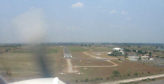 Um 12:23 lache ich mit dem Piloten für Viva in die Camera. Wir fliegen jetzt über die östliche Laharlandschaft auf Angeles zu. Es geht bergab und für das Flugzeug nach Hause. Das gefällt der Maschine und sie erreicht eine Spitzengeschwindigkeit von 220 km/h. Schluchten aus Vulkanasche und breite, jetzt trockene Flussbetten, in denen Baumaterial gewonnen wird. Der Flug wird unruhig, der kleine Flieger wird durch die böigen Fallwinde des Mt. Pinatubo ein paar Mal unsanft durchgeschüttelt. Als rechts Angeles und die Kirche neben dem Hotel Premiere auftauchen, sind wir noch 300 Meter hoch und ohne Böen kann der Pilot zur Landung ansetzen.