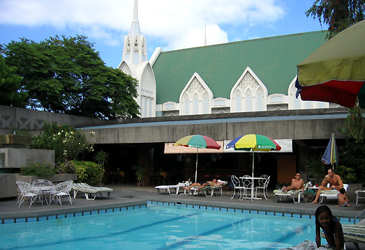Freiluftrestaurant (24 Stunden geöffnet), grosse Zimmer, Fussboden aus farbigem Marmor, Klimaanlage, Kabelfernsehen mit 50 Programmen einschliesslich der Deutschen Welle. In der Lobby residiert ein Reisebüro - sehr praktisch. 20 Dollar kostet ein Zimmer pro Nacht und wenn man im Restaurant früh, mittags und abends a la Carte isst, dann kostet das je nach Appetit noch einmal 10 bis 15 Dollar. Bei Langzeitaufenthalt gibt es Discount. Nur ein paar Schritte entfernt ist das Sunset Garden Hotel, beide Hotels mit ähnlicher Ausstattung unter einem Schweizer Management. Angeles ist eine interessante Stadt für Touristen. Durch den ehemaligen US-Stützpunkt Clark Air Base hat sich eine gute Infrastruktur entwickelt. Es gibt viele gute Hotels, Bus- und Flugverbindungen, Reisebüros, Einkaufsmöglichkeiten und auch die Vergnügungsindustrie fehlt nicht. Von hier aus ist der Mt. Pinatubo gut zu erreichen. Aber Angeles ist auch Ausgangspunkt für Touren nach Subic Bay, Zambales und zu den Reisterrassen um Banaue, in den Central Cordillera von Luzon. Wegen der guten (und preiswerten) Flugverbindungen kann man von hier aus auch nach Boracay und Palawan fliegen. Das Klima ist durch das Massiv des Mt. Pinatubo nicht so heiss und schwül, wie an der Küste von Zambales.
