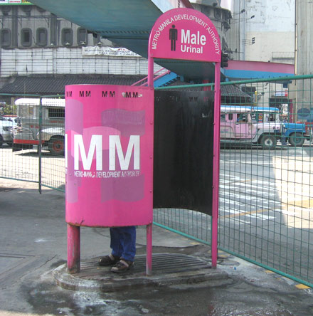 Diese Erfindung - leider nur für Männer - steht auf der EDSA in Cubao, der Nord-Süd-Ausfallstrasse von Manila. Aus meiner Sicht ist diese öffentliche Einrichtung ein Musterbeispiel für den Pragmatismus der Philippinos: Philippinos lieben die kurzfristigen Lösungen, sie leben in den Tag hinein und in ihren Genen ist fixiert: Lebe im Hier und Jetzt und schere Dich um nichts, was Dich nicht heute unmittelbar tangiert. Wenn man nach dieser Devise lebt, dann gibt es keine Probleme mehr, solange man Essen und Wasser hat und einem nichts weh tut. Das führt dazu, dass die Philippinos zwar in unseren Augen bettelarm sind, aber gleichzeitig sind sie wesentlich zufriedener mit ihrem Leben, als wir, denen es doch angeblich so viel besser geht. Sie wollen auch nicht unter allen Umständen den Lebensstandard der Ausländer erreichen. Es scheint ihnen klar zu sein, dass dann ihr schönes, sorgloses InDenTagHineinLeben vorbei ist. Dann müssen sie sich um Eigentum kümmern, müssen planen und tatsächlich auch mal über den Tag hinaus denken. Das wollen sie einfach nicht. Sie wären wohl schon gerne alle auch so 'reich' wie wir, aber sie wollen dafür nicht ihren Lebensstil aufgeben. Berlin, 16. April 2005, 10:51 Angeles